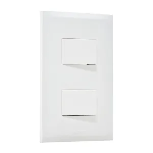 Placa eléctrica con dos interruptores sencillos de 15 amperes y 127 voltios, ideal para controlar dos circuitos de iluminación desde un mismo punto.