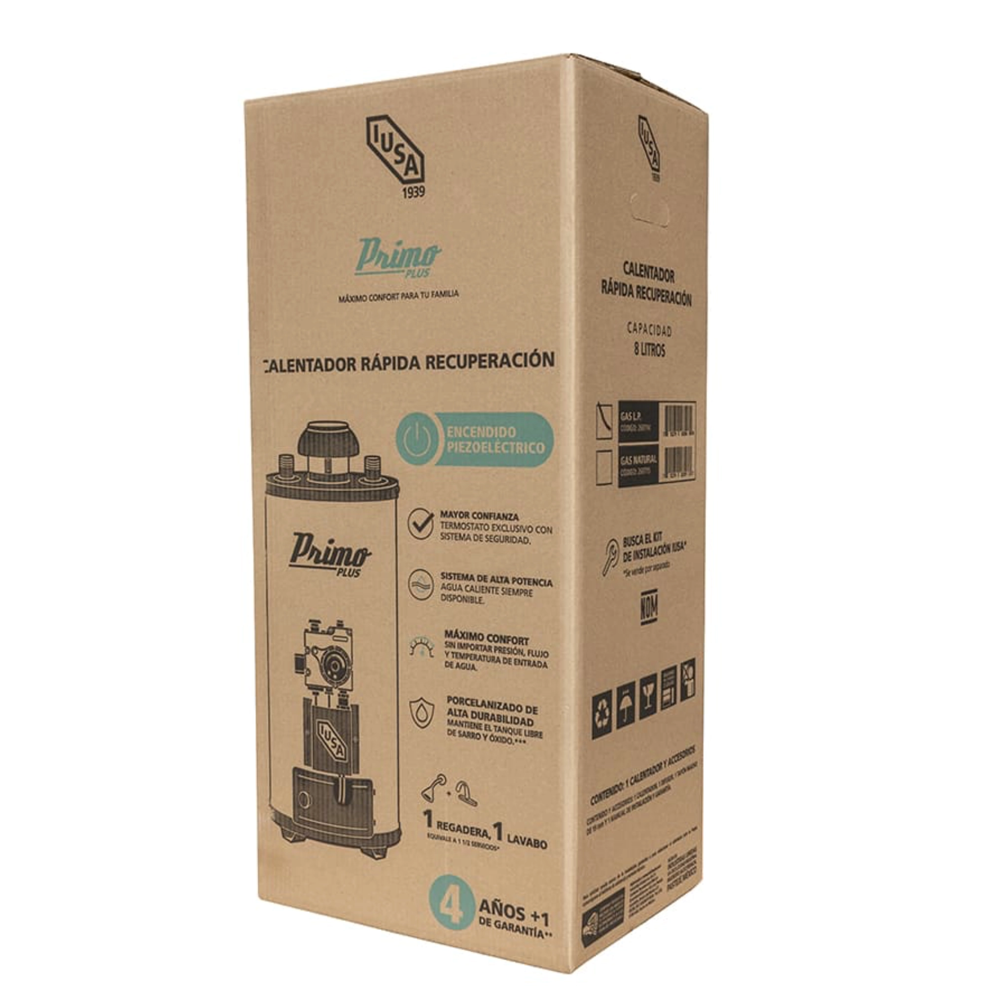 El calentador de agua Primo Plus modelo R08 LP de IUSA está diseñado para proporcionar agua caliente mediante un sistema de rápida recuperación. Funciona con gas L.P. y cuenta con encendido piezoeléctrico, lo que permite iniciar el funcionamiento sin necesidad de cerillos.