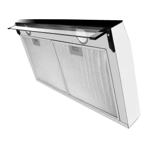 Integra un filtro de carbón de tres capas para operar en modo de recirculación del aire cuando no es posible instalar salida al exterior. Su frente combina acero inoxidable con cristal templado para un acabado limpio y moderno.