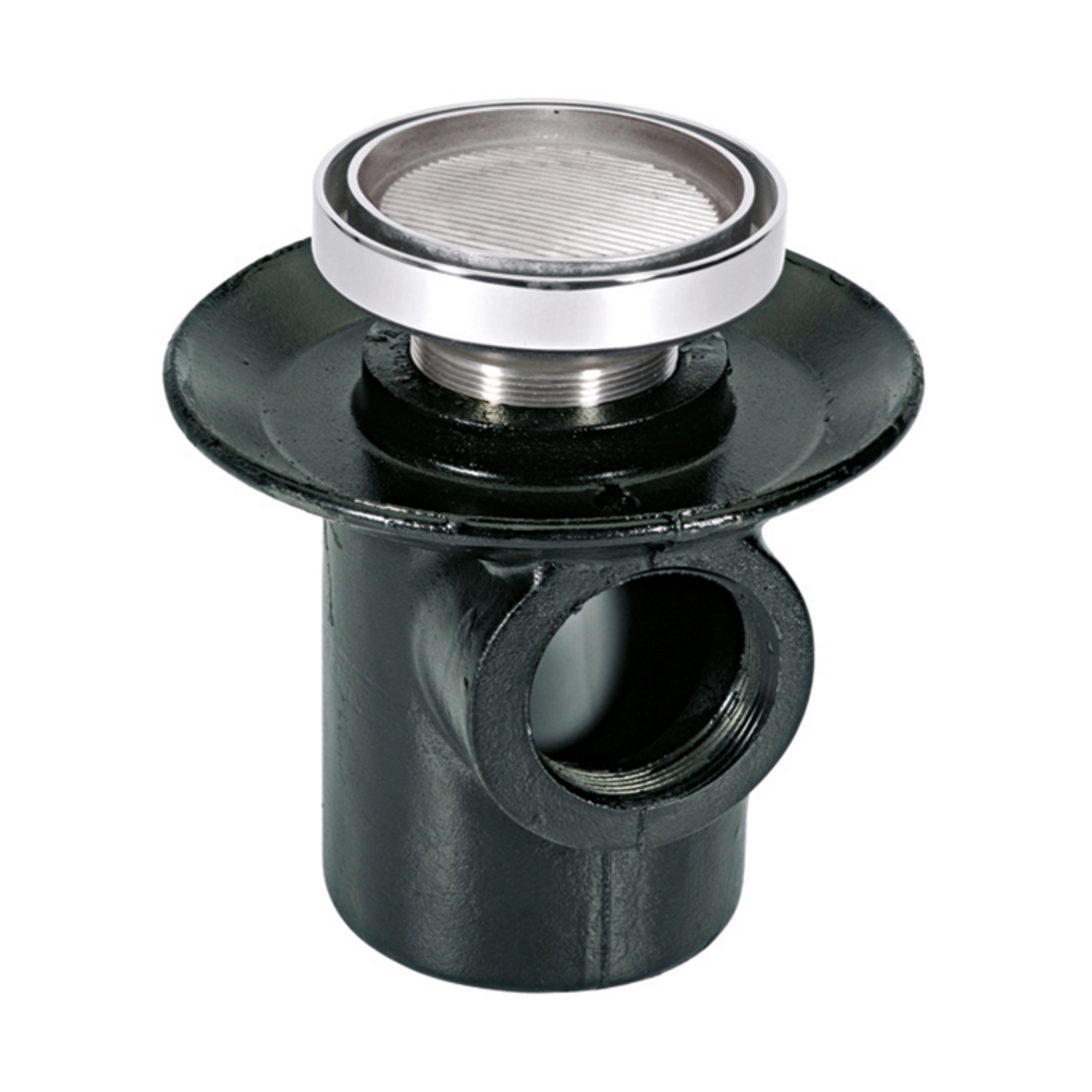 La coladera cuenta con una boca de salida lateral con rosca interna, permitiendo su conexión a sistemas de drenaje sanitario estándar.