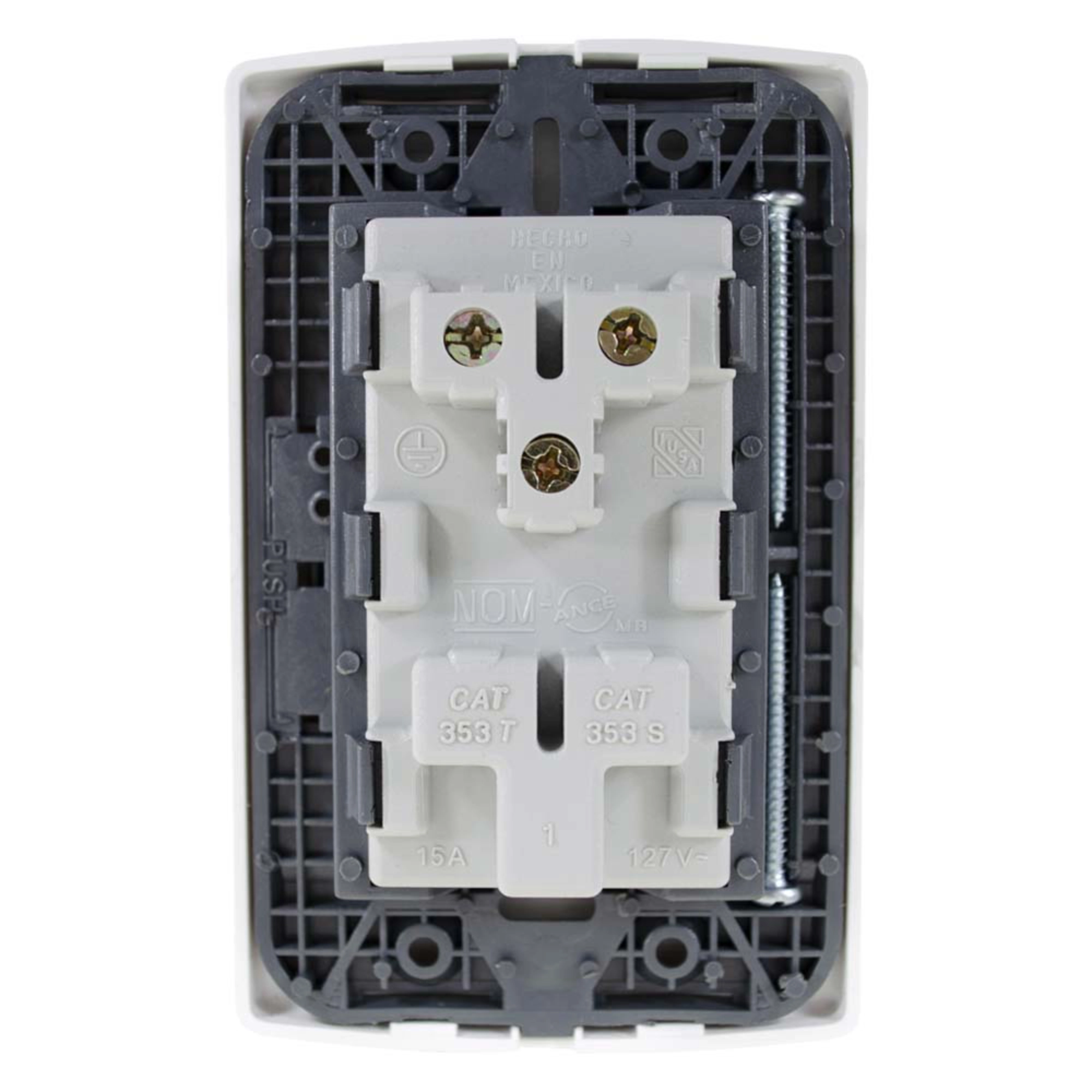 Opera en sistemas eléctricos de 127 V y cuenta con una capacidad de corriente de 15 A. Los contactos polarizados ayudan a mantener la correcta orientación de la conexión eléctrica, mientras que el sistema aterrizado permite la conexión a tierra del circuito.
