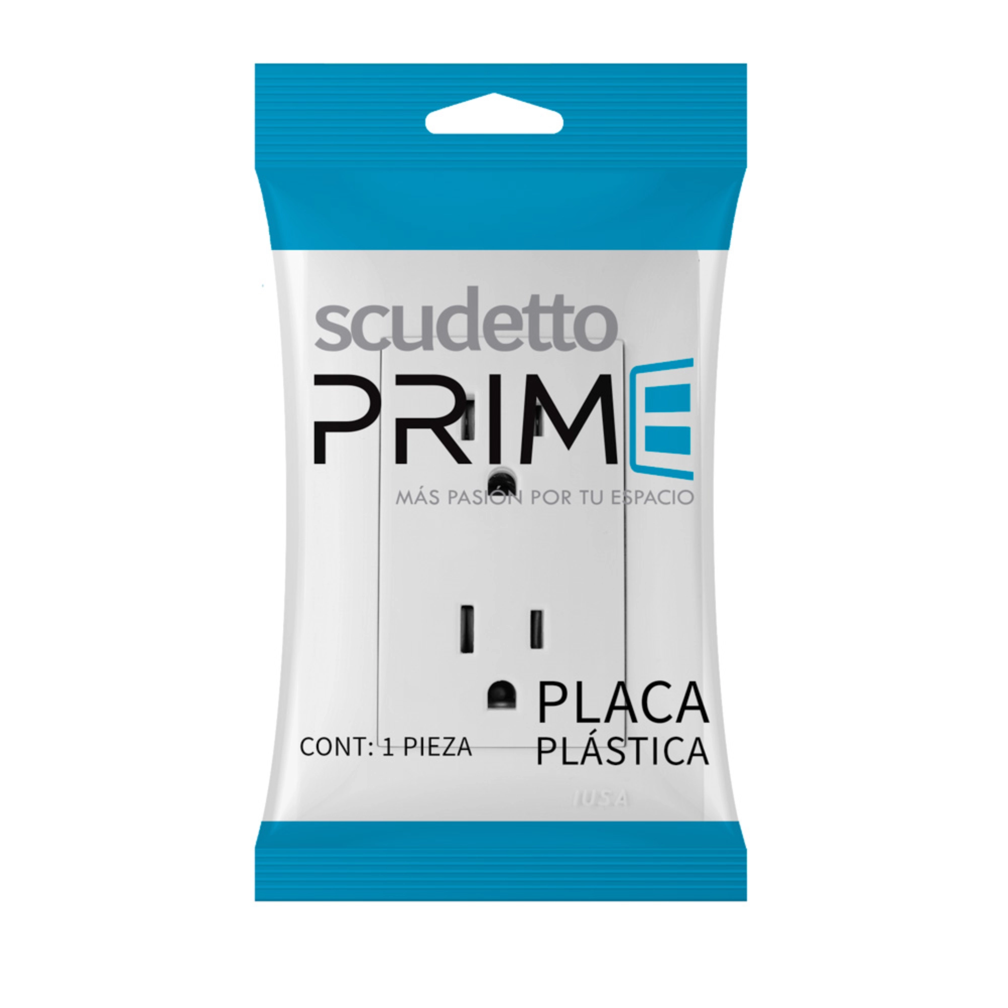 La placa está fabricada en material plástico color blanco y forma parte de la línea Scudetto Prime. Su formato armado permite que el conjunto de placa y contactos se encuentre listo para su instalación en el punto eléctrico correspondiente.